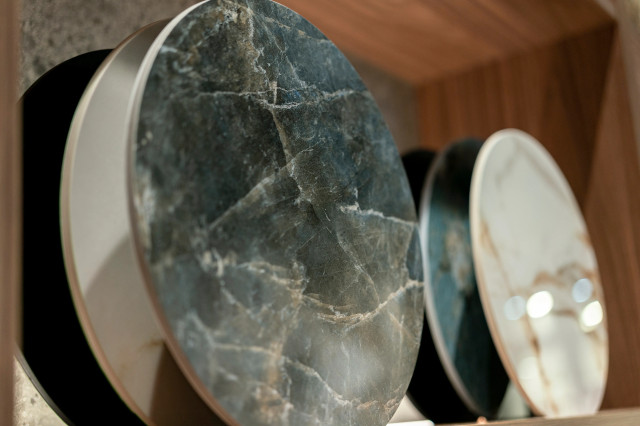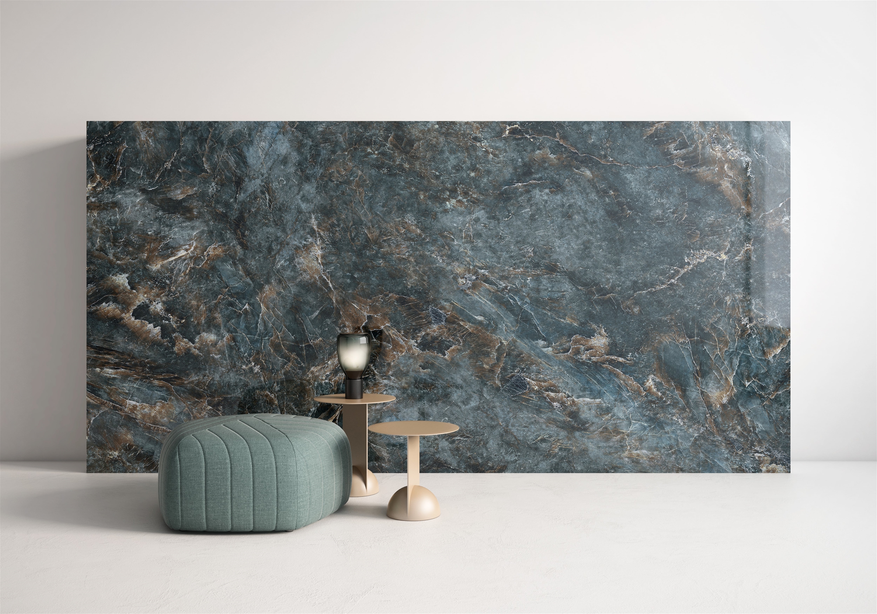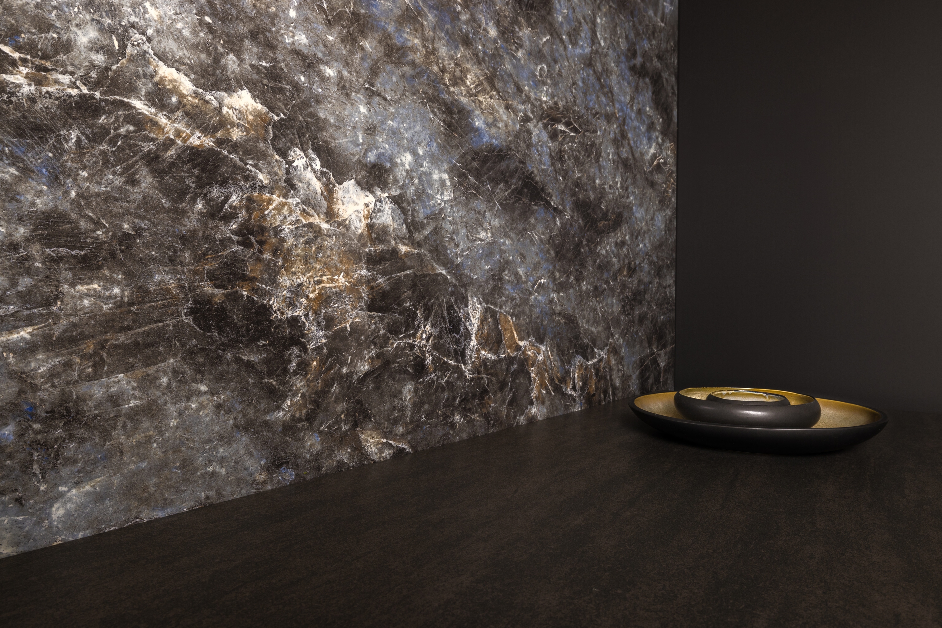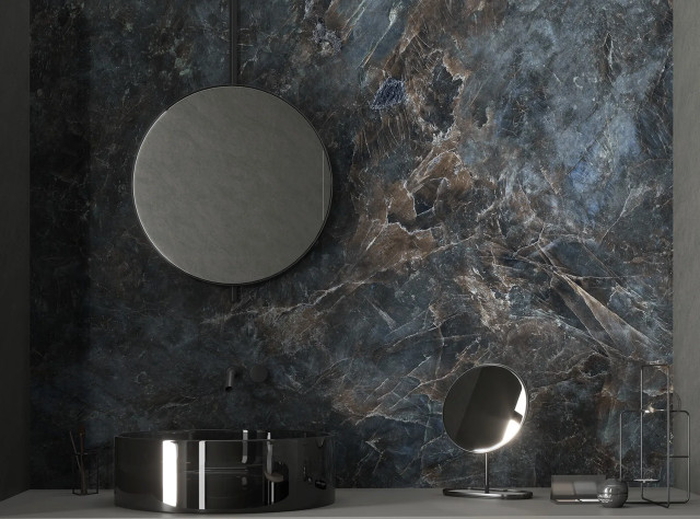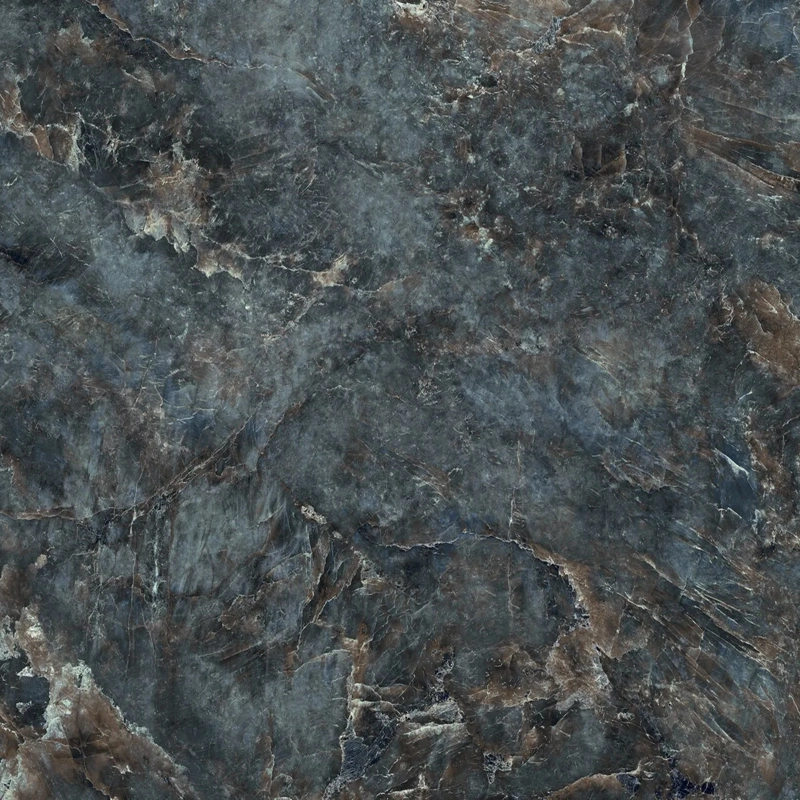 Its surface reveals a striking visual depth, where intense shades of dark blue intertwine with brown veins, creating a fascinating contrast, graphic richness and unexpected warmth.