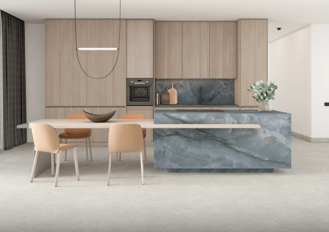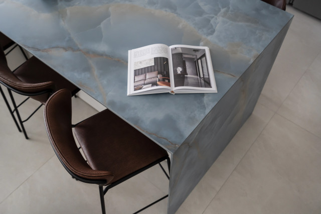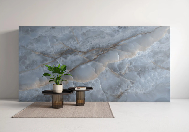 Onyx Blue is an extraordinary expression of elegance and depth, inspired by the enveloping shades of the sky. Its striking blue hue, rich in nuances, evokes a sense of mystery and serenity, as if it encapsulated the immensity of a mineral surface. The subtle veins that run through its structure lend it a delicate dynamism, creating fascinating plays of light that enrich its aesthetics and enhance its exclusive character.