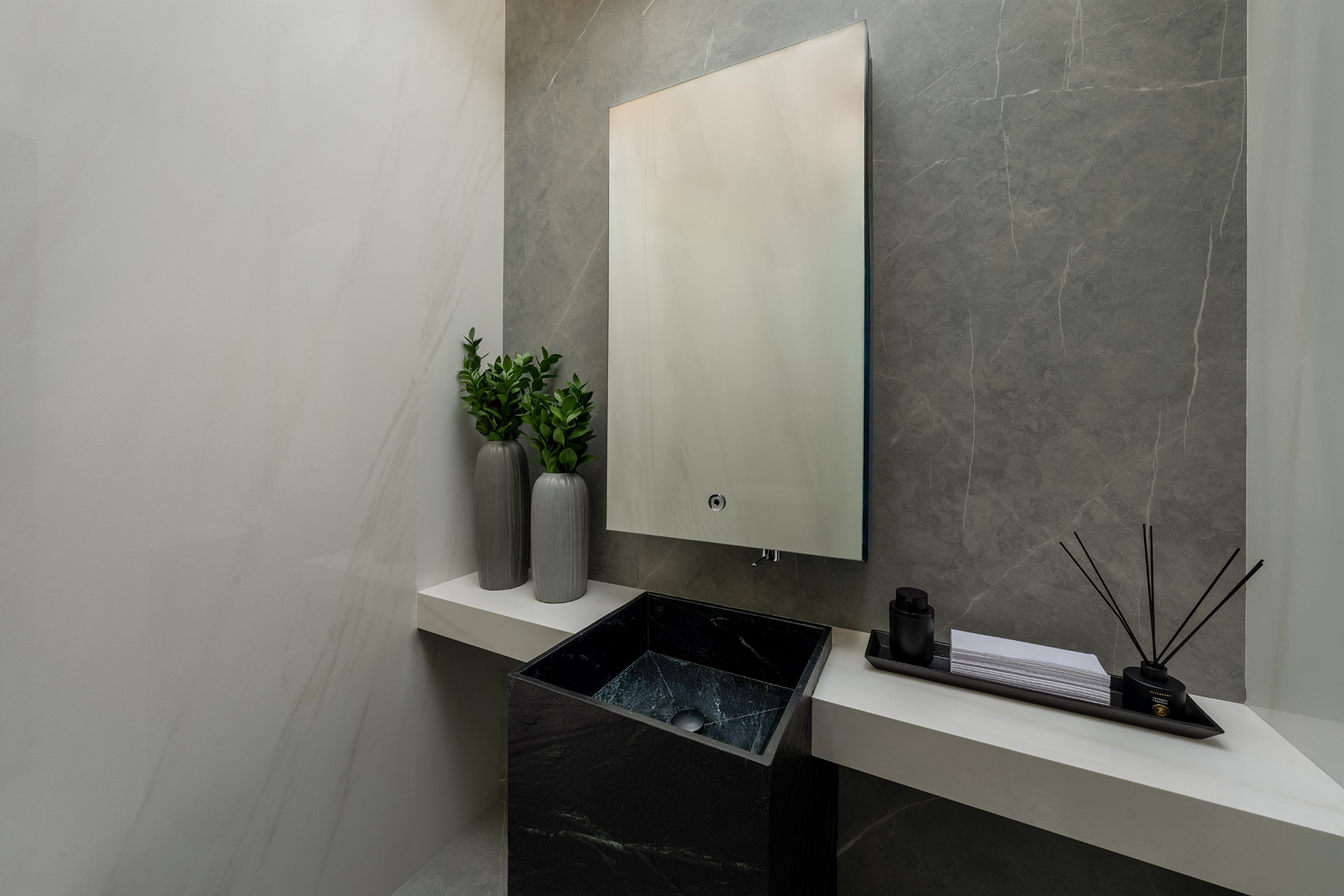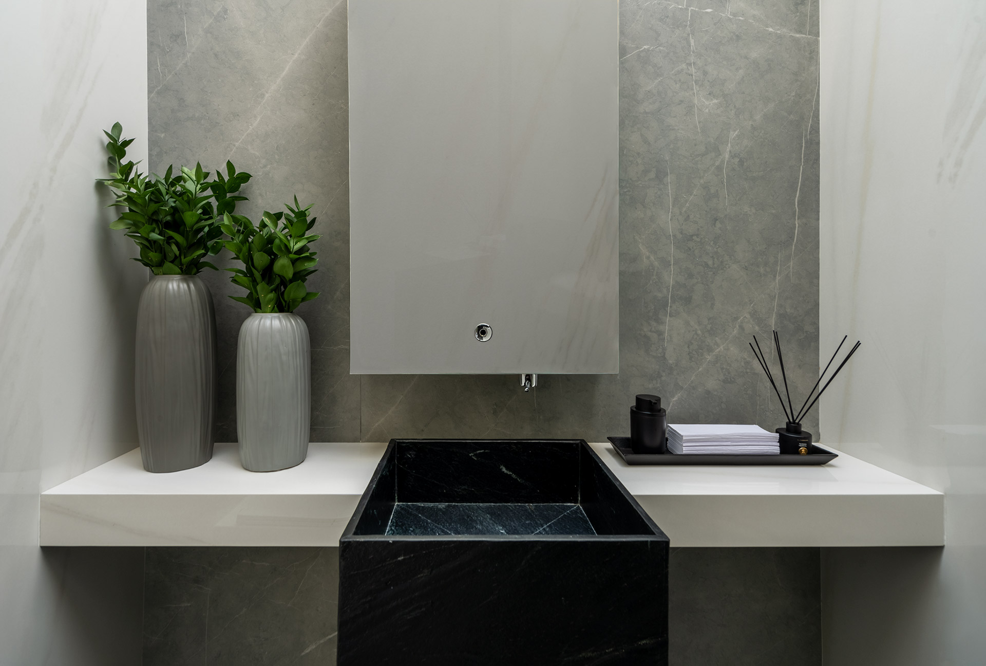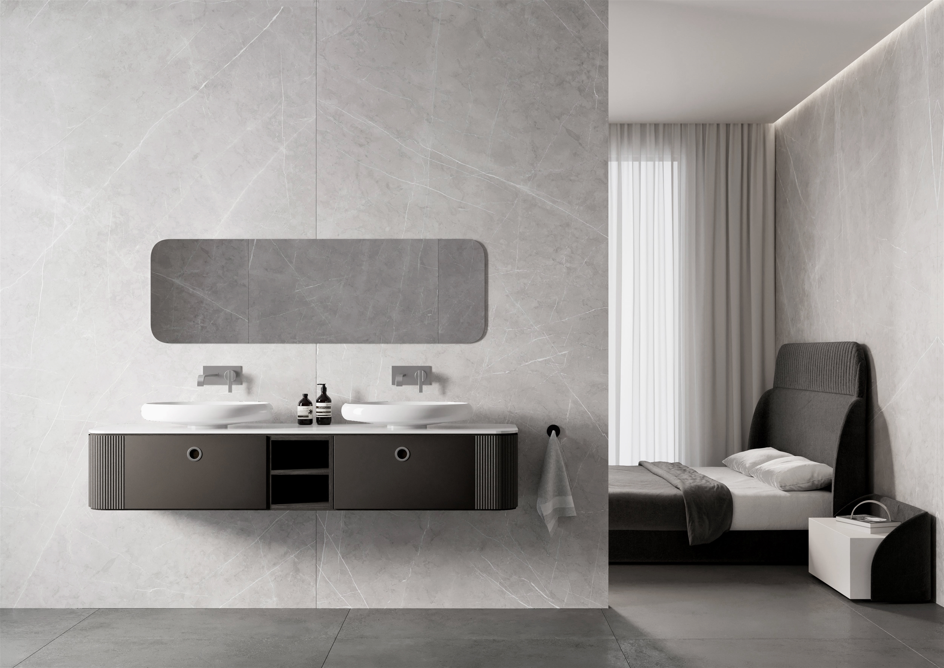 Armani Silver è una collezione di lastre in gres porcellanato caratterizzate da un delicato colore grigio, che evoca serenità e un sofisticato stile architettonico.