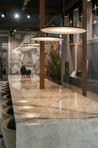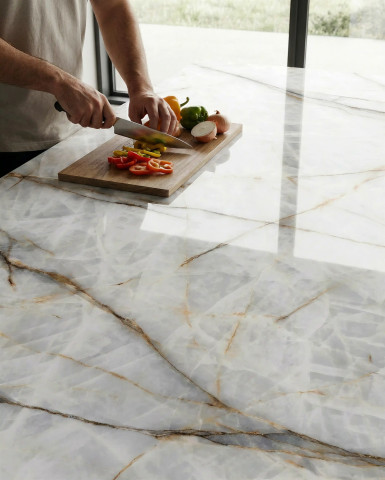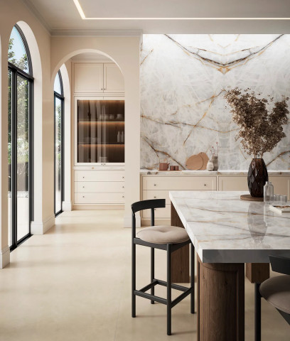L'Aura Lux White cattura l'essenza della natura, trasformandosi in una tela che racconta storie di luce e movimento. Ispirata alle magnifiche venature naturali, la sua base luminosa mette in risalto intricati disegni nei toni ocra e grigio che si intrecciano sulla superficie.
