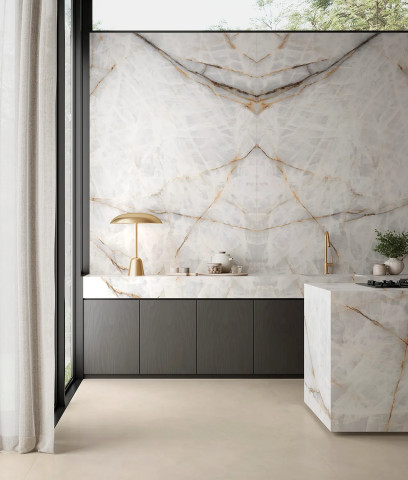Ogni ambiente si arricchisce di profondità e carattere, evocando una sofisticatezza unica. Le venature, simili a fili dorati e fumé, non solo decorano ma guidano lo sguardo, creando una texture visiva che aggiunge dinamismo a qualsiasi contesto.