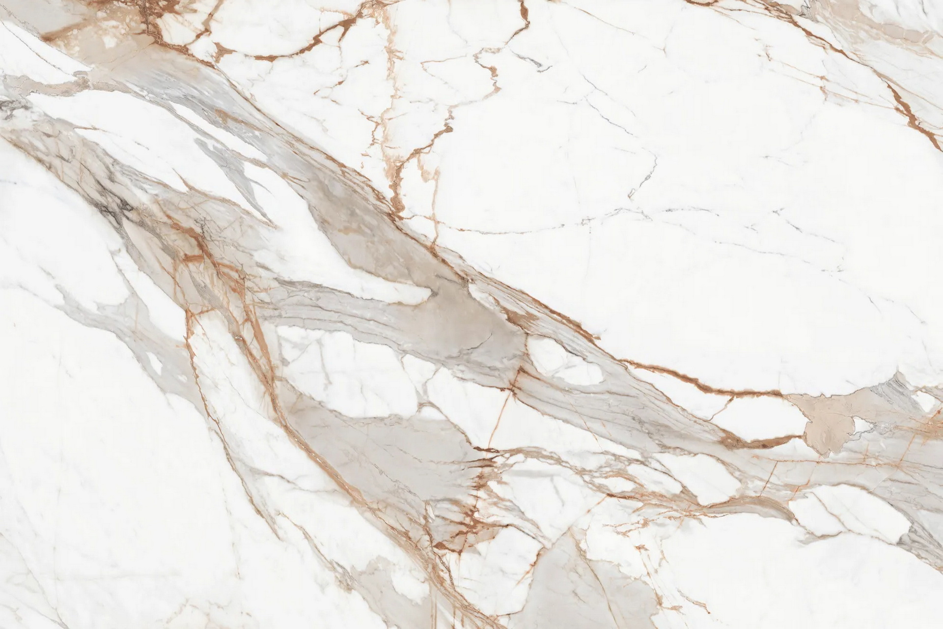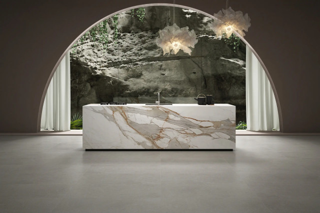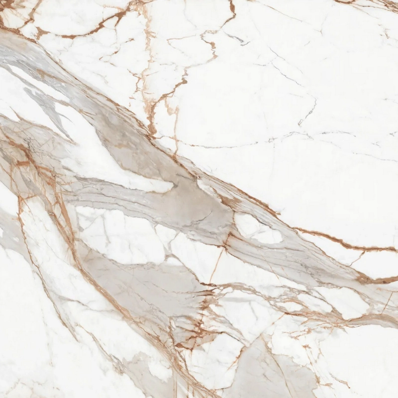 Le lastre in gres porcellanato Macchia Vecchia sono caratterizzate da uno sfondo bianco avorio e venature grigie intense con riflessi arancioni.